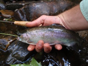 First to the Phd hole. There were some consistent rises and I tossed a variety of BWO and generic looking looking emergers. I kept missing fish and was getting a little ticked. Figuring I had spooked the pool, I moved up to the next spot. First cast, nice chunky rainbow. Now, I’m a native fishist, and was really tempted to keep that alien of a fish in what is to be managed as brookie water, but dinner was a long way off, and didn’t feel like messing with it so early in the morning, there’d be others…