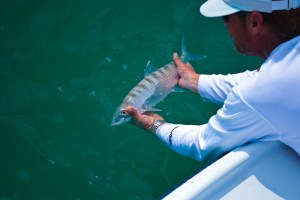 We move along looking for more rollers, but the poons were giving us the fin so we move over to the bonefish flats. This was where, Chris decided he needed to make himself a Bacardi and diet. He had left the rum out in the 90+ degree heat so the first few sips were a little rough. Up on the bow he goes with a shrimp on his hook dangling in the water as Sean pushes us up the flat. Suddenly a bonefish appears at 12 o’clock about 80 feet out moving towards us. Chris sees him (the only bonefish or tarpon Chris actually sees all weekend) and fires the shrimp out there. The bone sees an easy shrimp cocktail and chows down. Chris stuck him good. The silvery torpedo makes a run toward Cuba. Five minutes later, the only fish boated that weekend is on the measuring board, pictures taken, and released. The Barcardi was “magic” rum.