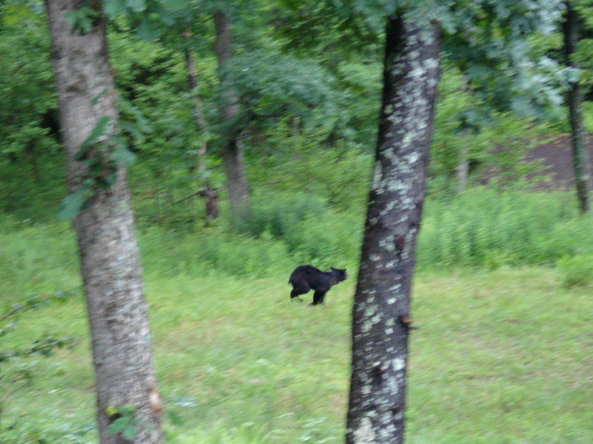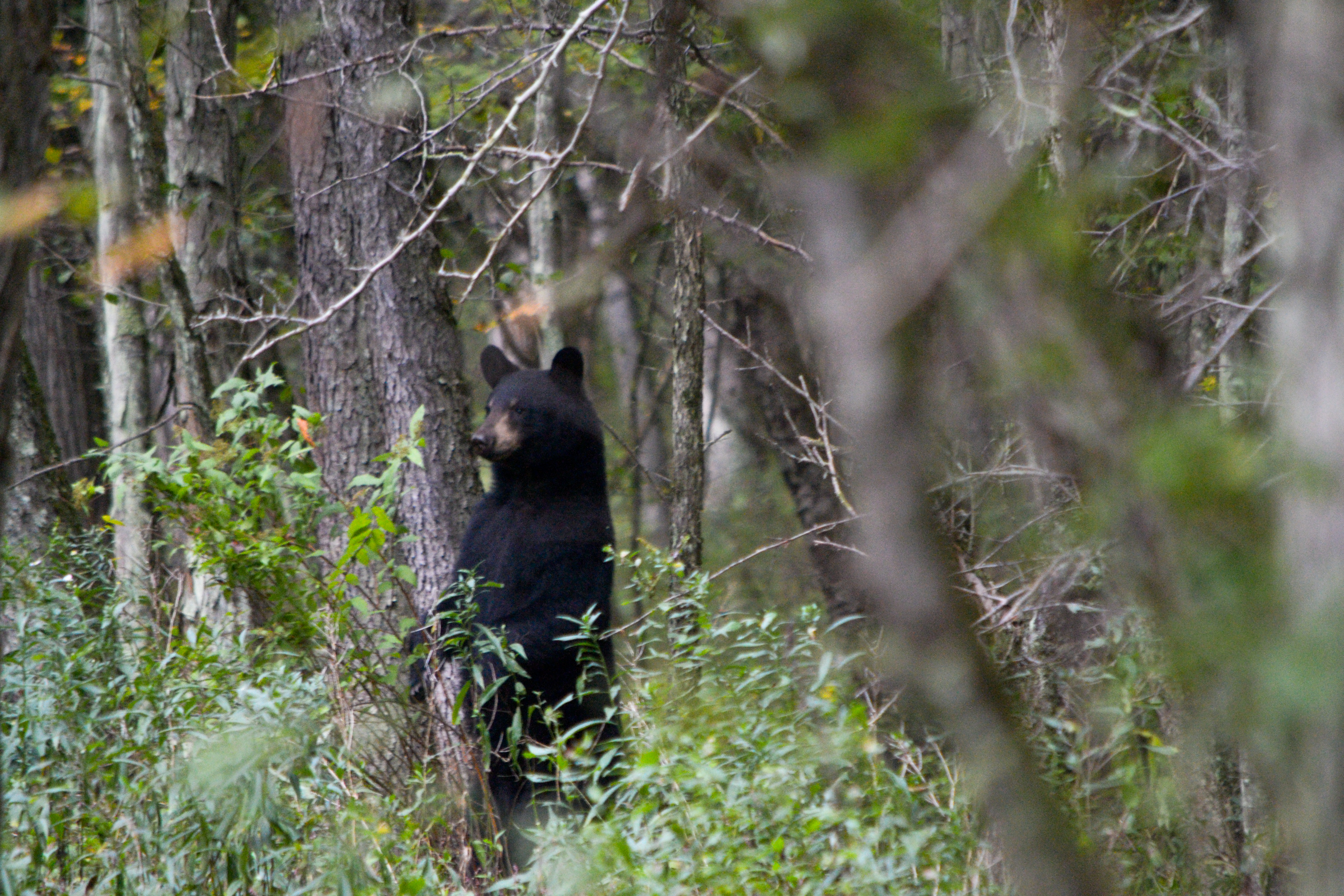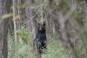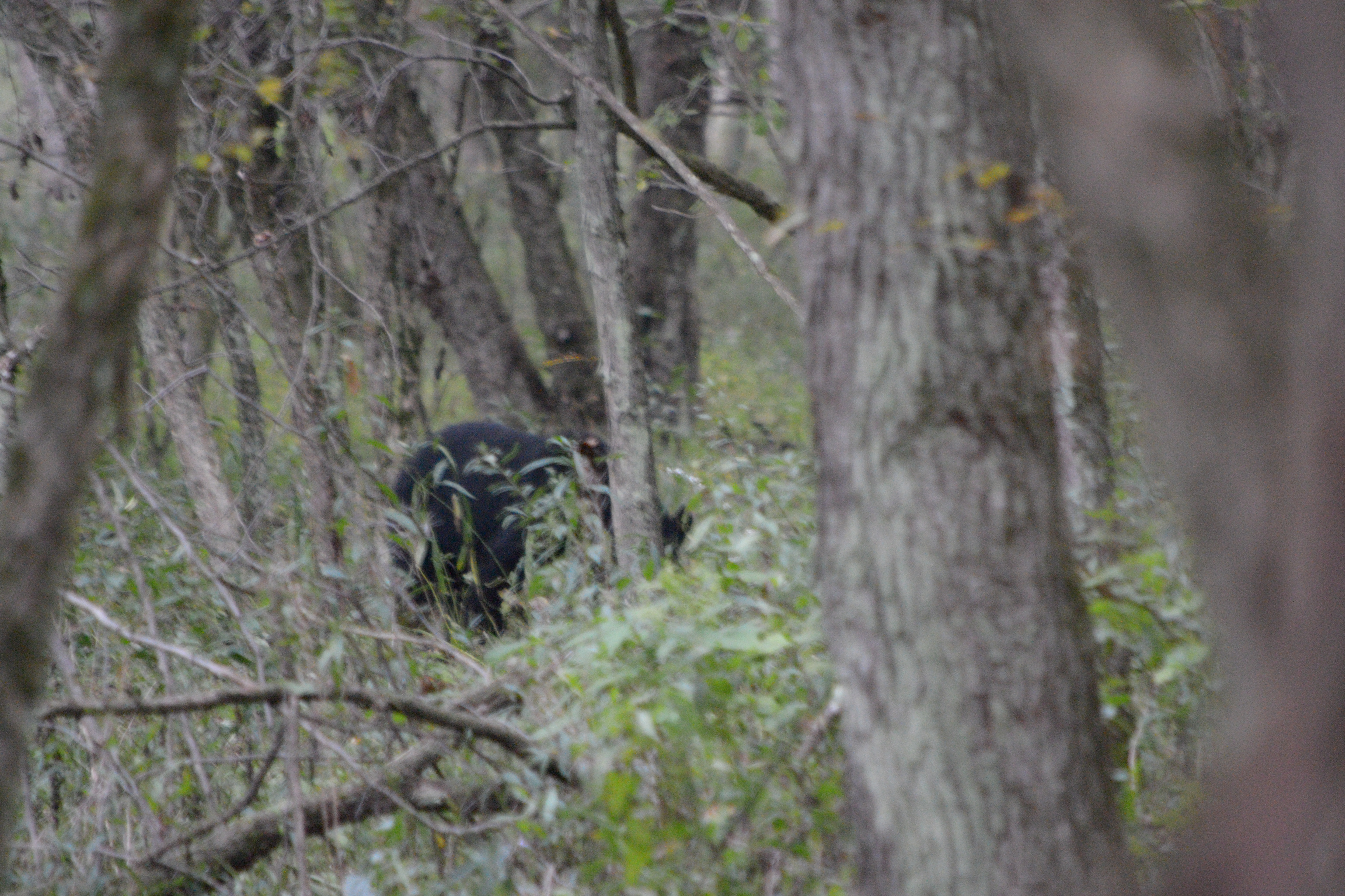 I begin trying to snap photos through the thick brush, capturing a black mass and foliage. Two other cubs take off, Dad must have been more concerned about is hunger than the kids. I keep snapping away. Ryan is trying to get pics too and some video. In hushed tones we consult as to how to get better pics. I turn and look back, and Greg is still crouched on the trail. Good, he didn’t get eaten.