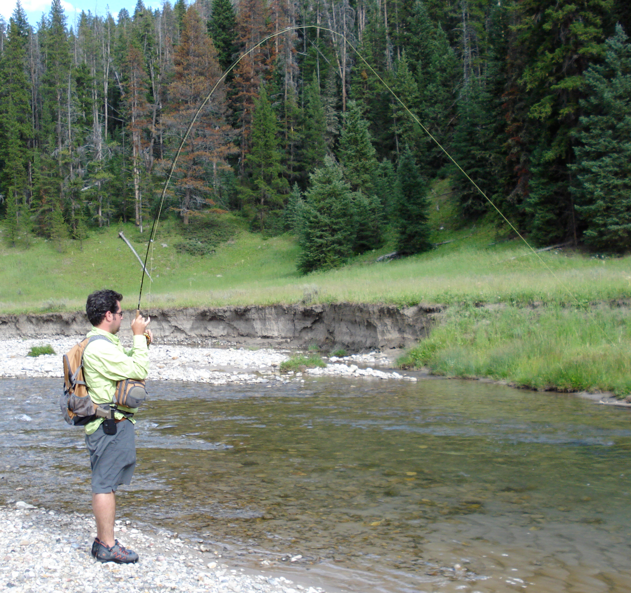 The first time I encountered them there was a pair of cubs running past the house where I was staying. The second, the two cubs’ mother was moseying down the street at dusk. The third involved an overturned “caged” trash recceptical and a pile of scat the size of a manhole cover. The fourth was when I’m rolling with KG near the uppermost stretches on the Savage and a big sow is wandering down the road. Kevin decides to give hot pursuit and she heads up the hill. Last summer I was fishing with a Glock on my hip and Don had the 12 gauge on his shoulder as we fished the upper Taylor Fork, a valley boasting one of Montana’s most dense populations of brown bear. Didn’t see one. The most recent, and one that truly counts as an encounter was last Sunday.