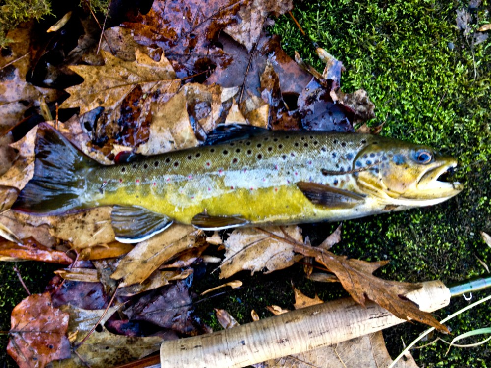 The poor little bastards have gone through the emerging stage only to find the air too cold for them to have the energy to leave the sticky pull of the water’s surface tension. Timing is everything, but if in the next life you come back as a caddis, have the good sense to emerge in the summer when you have a sporting chance of flying away and not end up as a late fall breakfast treat in the stomach of a trout. I sort out my line, rig back into dry fly mode and tie on a caddis bug the closest I could get to the poor wriggling bastards. I just happened to have my caddis box only for the nymphs with no intention of using dries so therefore the fly floatant stayed in the bag in the back of La Poderosa, so this was going to be a day full of false casting. First cast with the little caddis bug, a quick swing and a miss by a nice 12″ brookie. Several false casts to dry the bug back out, drop it in the same spot, fish on! I bring in a brookie still in his halloween colors. For the next hour or so I bring in another half dozen while hooking and/or missing three times as many.