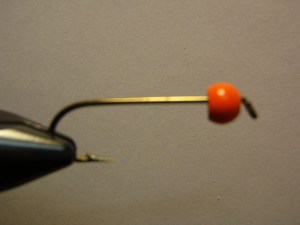 1. Get your streamer hook and a orange cyclops bead…….put it in the vise.