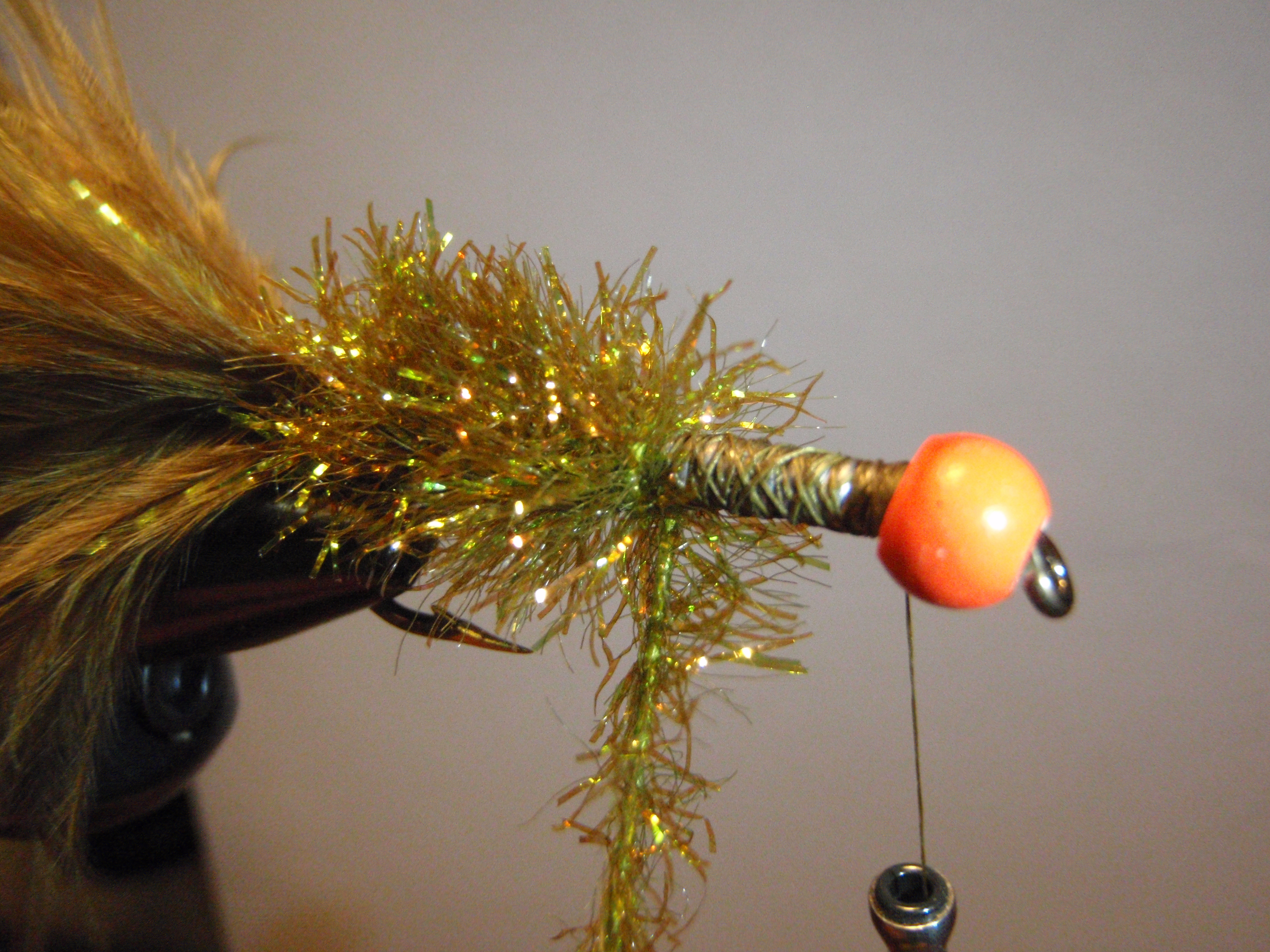 4. Once the marabou and flash is tied in take your olive crystal chenille and wrap it up to the orange cyclops. As you make each wrap stroke the previous wrap back. That is one of my pet peeves seeing flies that are wrapped with crystal chenille and it is not clean wraps. Sorry had to bitch a little.