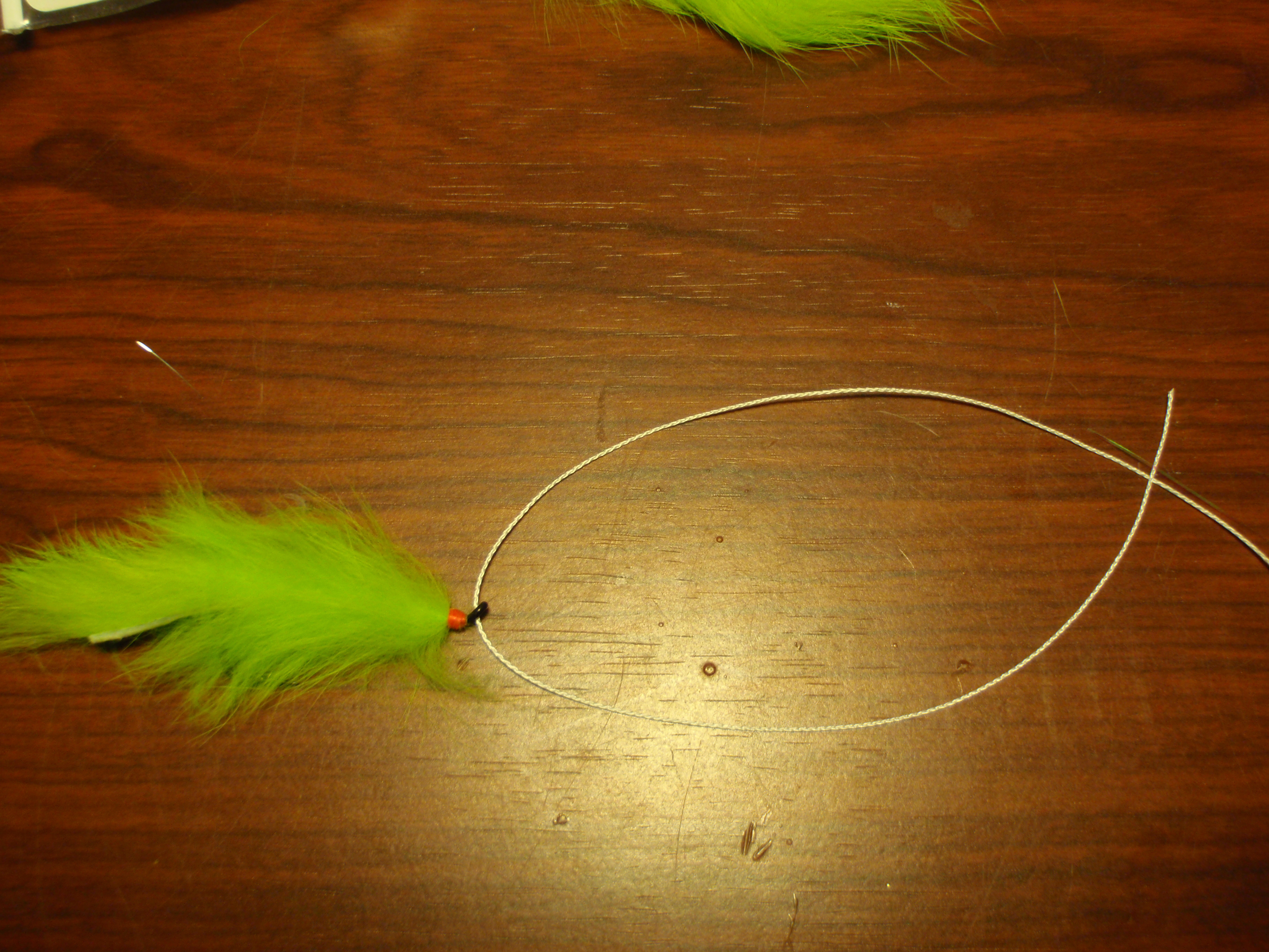 2. Get yourself some fly line backing or any type of 25 lb. or higher braided line to connect the rear fly to the front one like so.