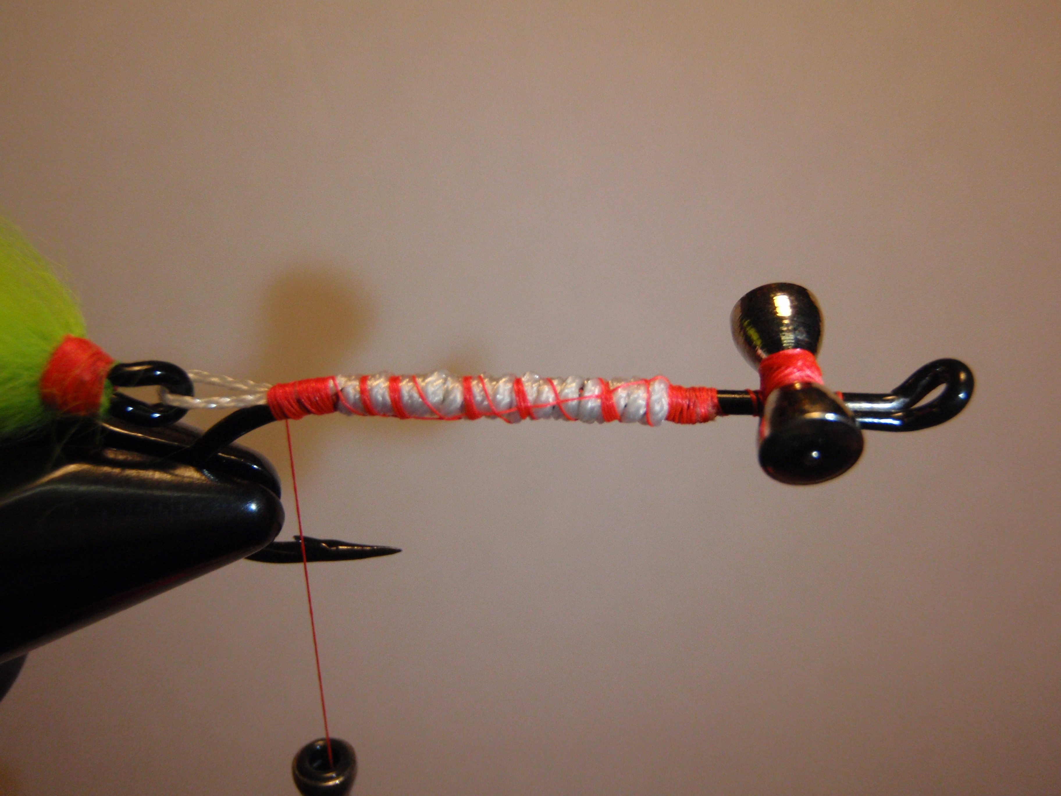 3. Tie in your dumbbell eyes as well as the the braided line. Go ahead and hit both of those with some hard as nails or head cement. Once those dry for a minute go ahead and tie in your rabbit strip and wrap it to the back of the eyes.