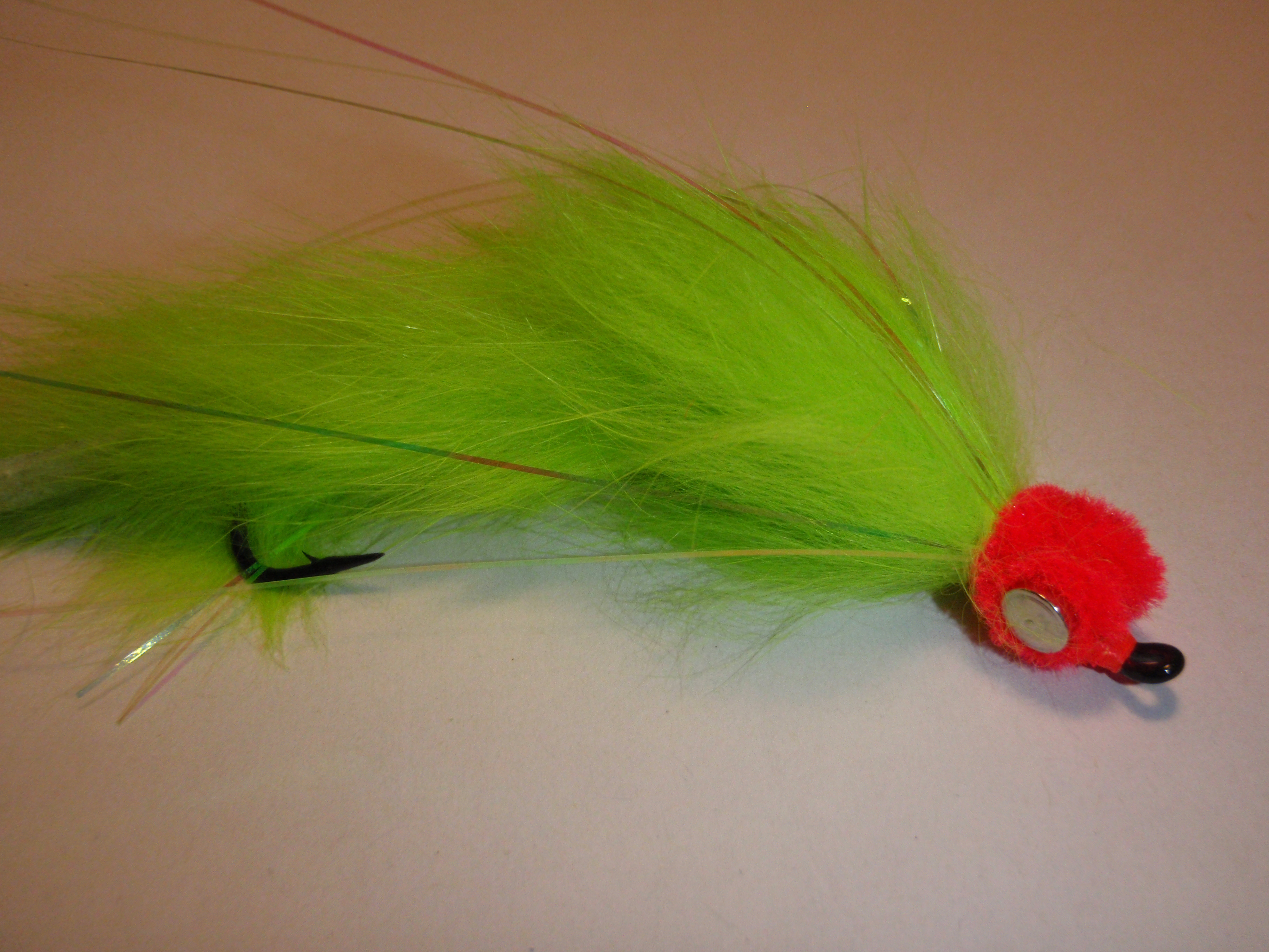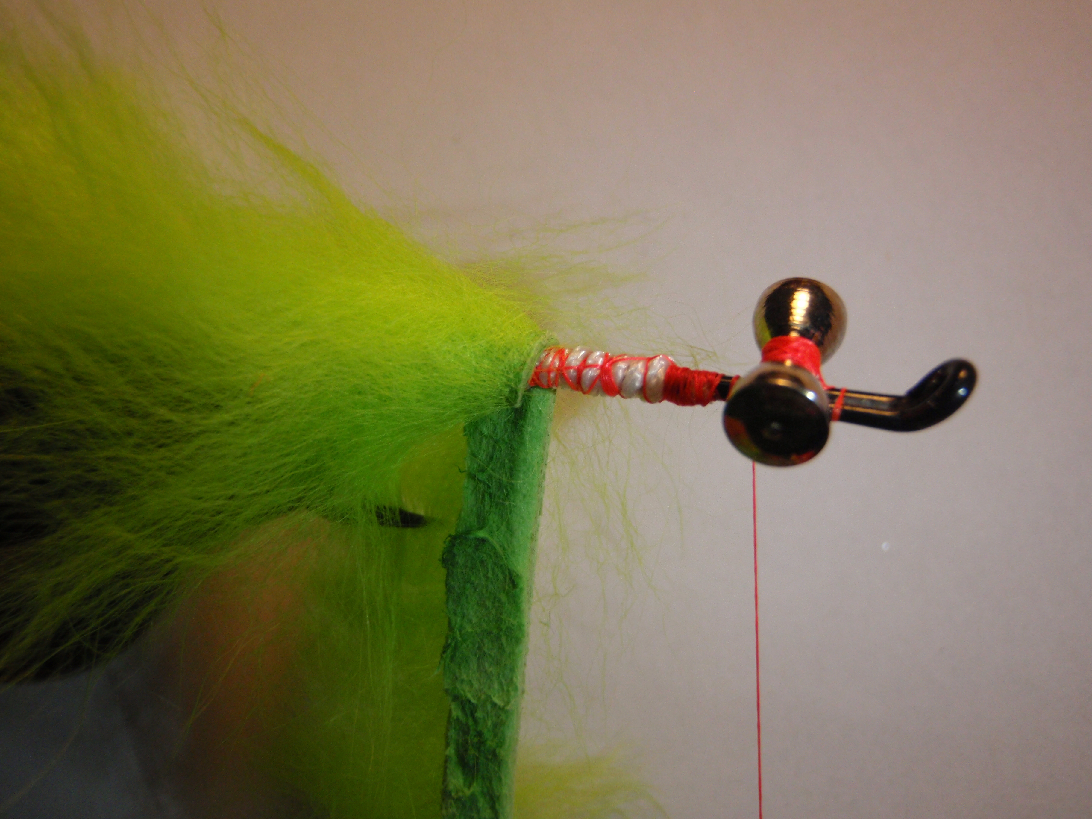 1. Get two streamer or salmon hooks. Since this is a articulated pattern we will use two hooks. On the rear hook tie in your chartreuse rabbit strip and wrap it to the eye of the hook.
