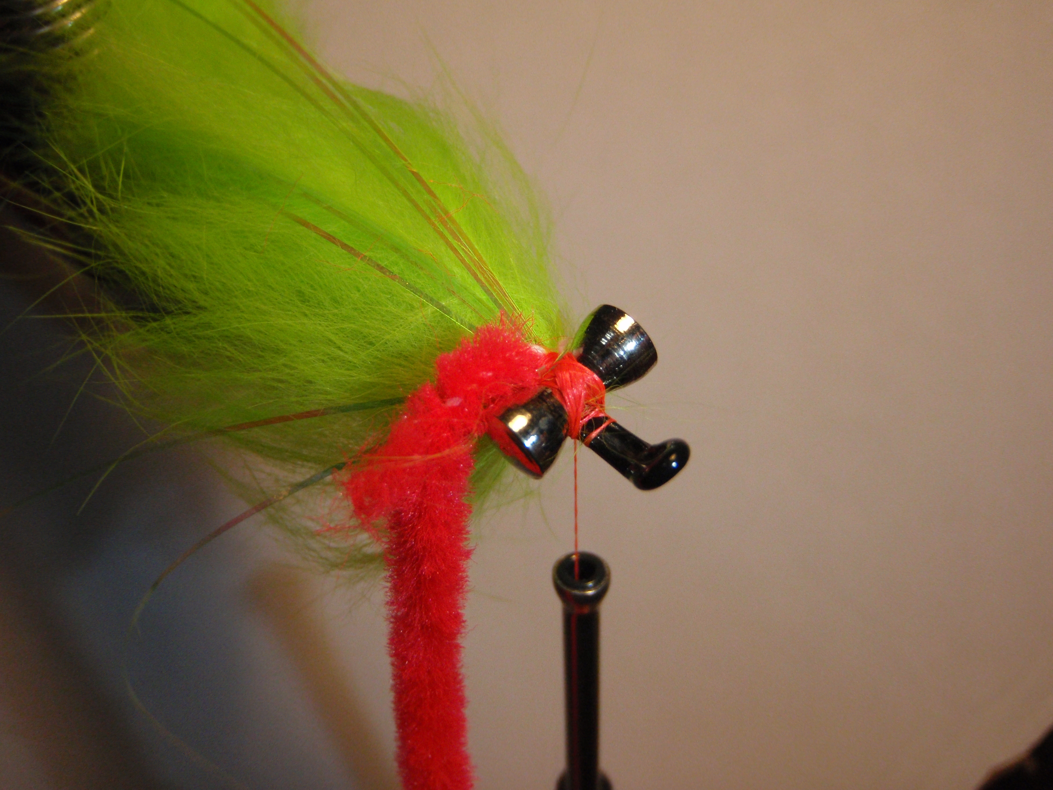 4. Tie in your Flashabou right behind the eyes along with your chenille. Take your thread to the eye of the hook and go ahead and wrap your chenille around the dumbbell eyes and then tie off.