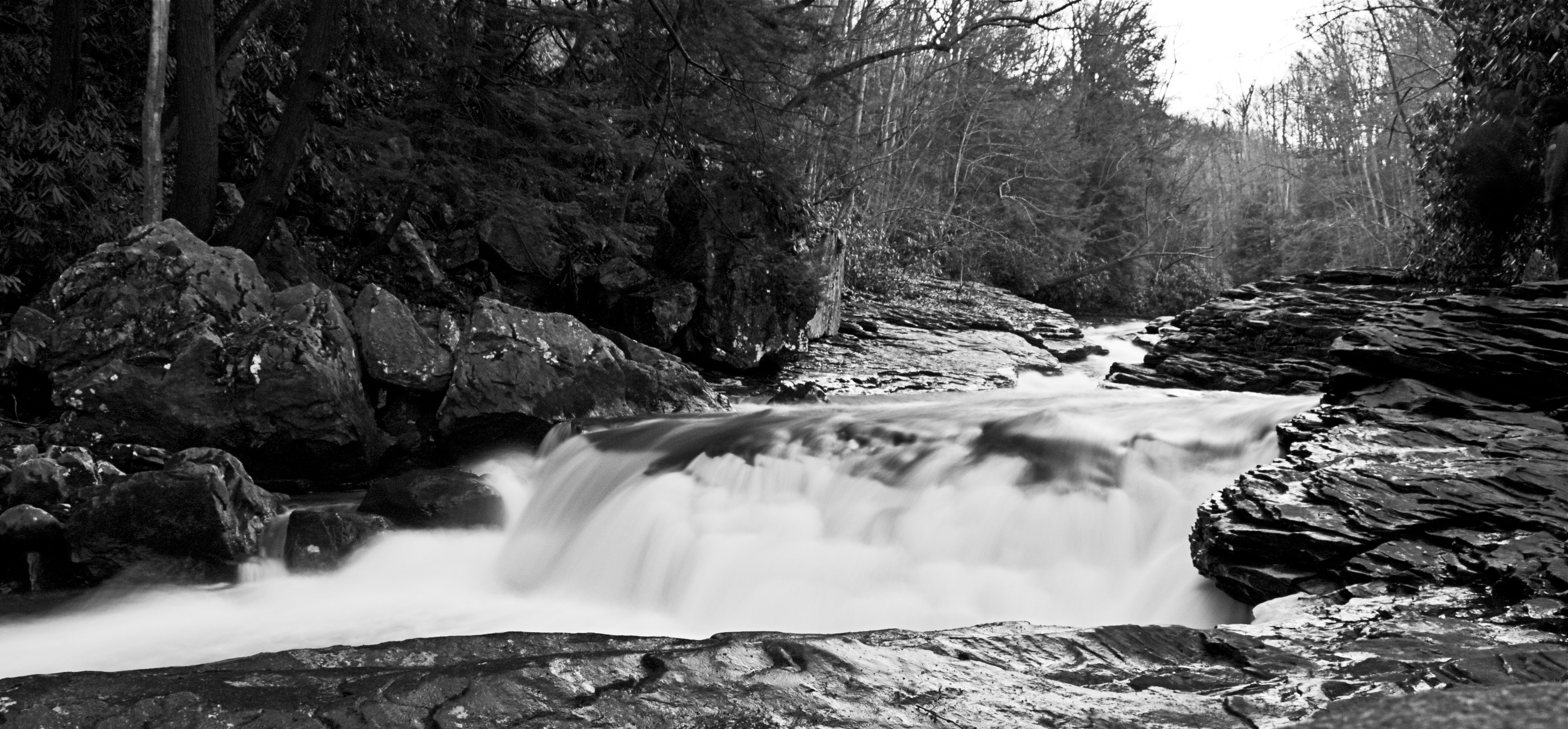 We had several consecutive January’s of ill content and weather in the taint between the East Coast and the Mid West. Last weekend gave us a day in the mid 50’s, sun and blue bird skies. What else to do but hand hard earned bread to the PA Fish and Boat commission and hit some water. I ran down to the Laurel Highlands and fished the Yough a little to no avail than decided to try Meadow run from the water slides down to the mouth. If nothing else, when it’s not the middle of summer with all of the tourist’s kids screaming and scraping their asses on the rock slides, the place is quite breathtaking when enjoyed in solitude. With the abnormally pleasant weather there were surprisingly few people out and about in the Ohiopyhle environs so I mostly had the place to myself…excpet for hipster girl and white boy dreads. I was fishing and they were trying to take pictures. I say trying to take pictures because white boy dreads was struggling to take a long exposure shots of the water falls. Him and hipster girl began to argue a little about what their different photography teachers told them to do. I got annoyed and showed them how I do it. The picture below is what I demonstrated:
