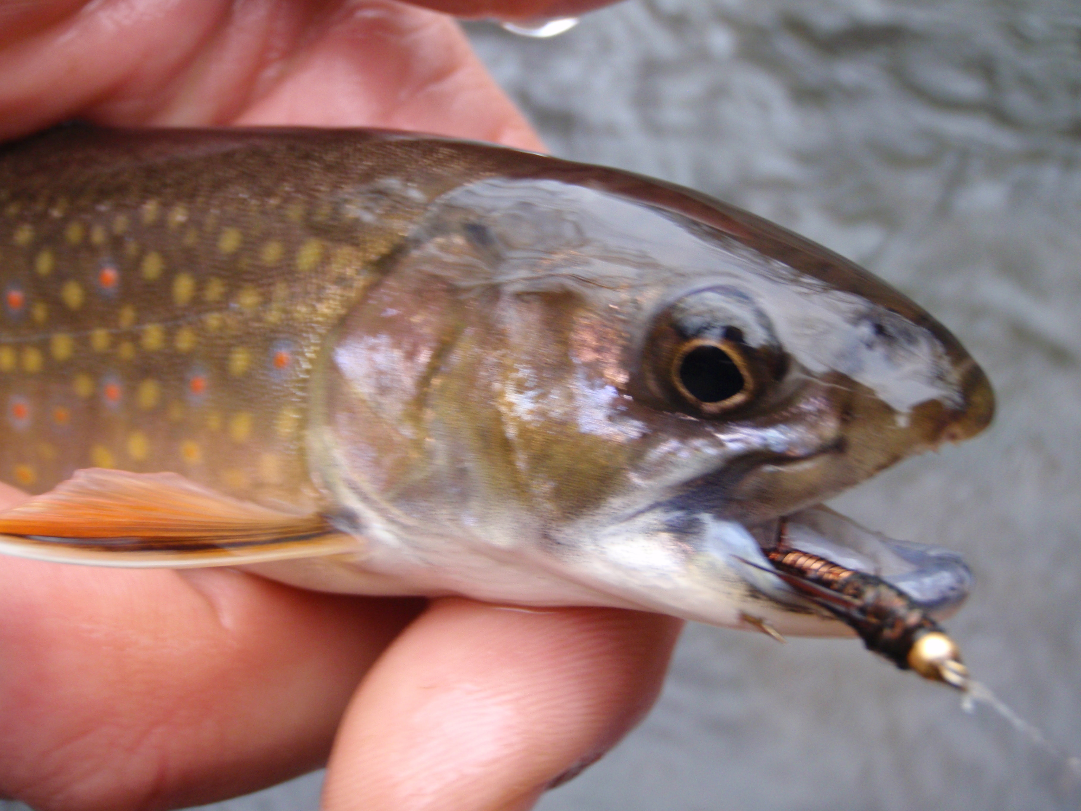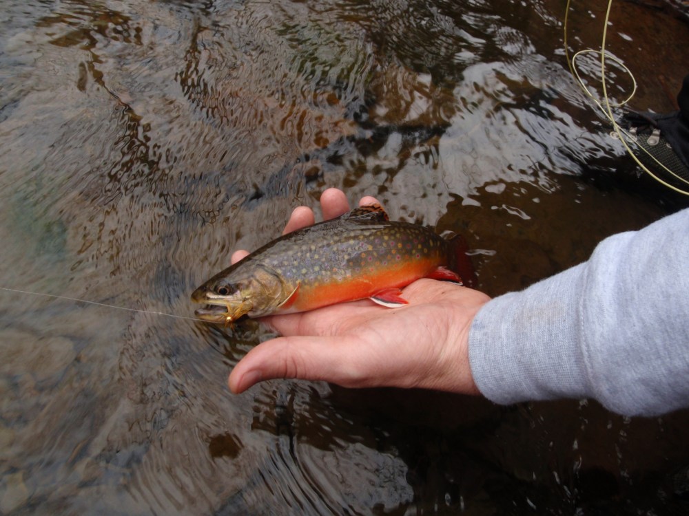 We landed onto the Lower Savage first to find that Adam was the star of the show. Steve-O and I filmed until we had footage of Adam setting the hook and landing a Rainbow for the first time on POWERBAIT at the Lower Savage. Just kidding, Adam was using a size 18 Dry and that is what he hooked the fish on. He was very persistent on this fish because he missed it two times earlier. That was Adam’s first but I also had a first as well. My earlier post I mentioned that the next fish I catch would be for our good friend Gene. I was fishing a wired stone on a section that I have fished a lot and as I was drifting my rig down through the hole I felt a tap and then a hook up. It was the first fish of the year for Maryland and wouldn’t you know it, a native brook trout. Surprising this fish would have been for Gene as well as the first Brook trout I ever caught out of the Lower Savage. I like to think that it was a meant to be type of situation and the more that I think about it, I am convinced that it is.