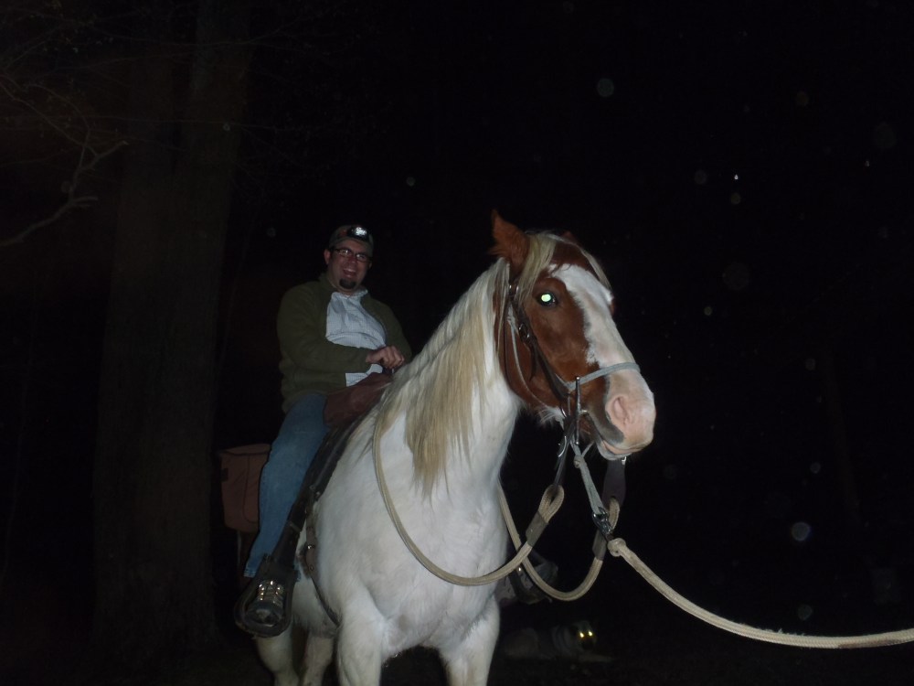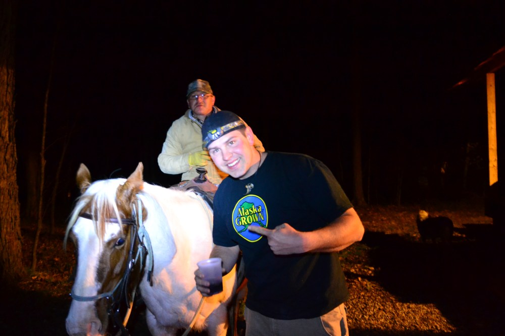 We loaded Steve-O’s gear and made our way to camp. The ride up always seems to go fast because you are excited and looking forward to what’s to come. We rolled into camp to find some family already there as well as an English Bull dog named Bentley automatically trying to hump Lulu. We cracked open the Victory beer while we claimed our sleeping areas, that is one good thing about getting to camp early. We are pretty much done with the cabin but we haven’t built bunk beds in the loft yet so everyone crashes on cots. Steve-O and I got two spots upstairs with lots of room. Friday night was a different story, the living room area was what the Eastern Rise’s boys call 100% Man Carpet. unfortunately, I did not get a picture of that to show you what we mean. We got everything settled in and the drinking became the priority. A few hours rolled by and there we sat at the campfire when all of a sudden we heard a clicking/knocking sound back in the woods. At first Steve-O and I thought it might have been Sasquatch, but a few minutes later we realized what it was. We looked to the side of the Cabin to find a guy on a horse with a dog that could have passed for a Wolf just standing there. It caught us all of guard because we never have things like this happen. After a few seconds my Uncle proceeds to say “What the fuck” followed by “Who the fuck is this” followed again by “Is this really fucking happening”. The cowboy and yes I mean 100% cowboy decides to ride up to the campfire and introduce himself as Joel. At this point we all are still speechless until I start to talk to him. I asked him where he was coming from and where he was heading. His response in a drunken tone was “Coming from Kelly Pines and was riding until I found a campfire”. Kelly Pines is about a 7 to 8 miles and takes about 20 minutes to drive it. It took Joel about 2 1/2 hours to ride his horse and it’s now 10:00 p.m when he rode in. At that time we knew the night just got more interesting.