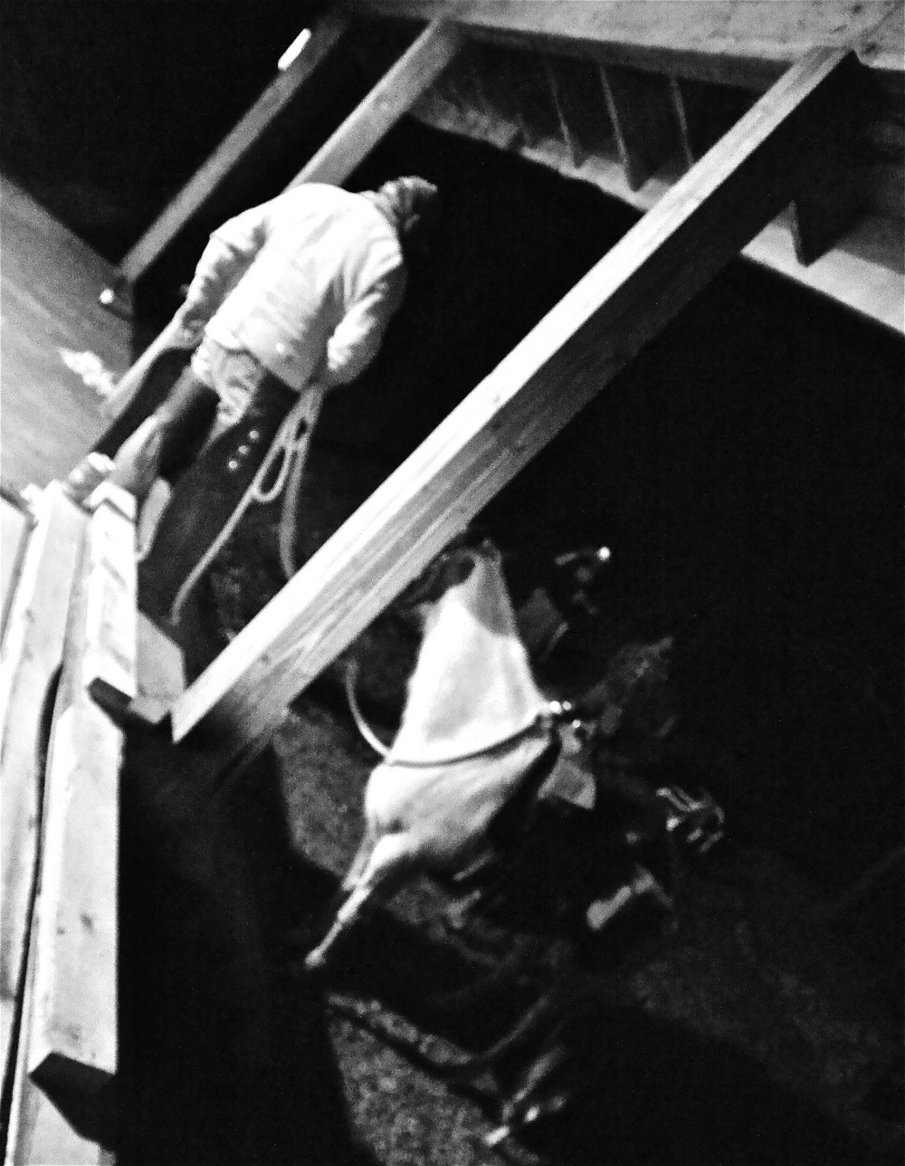 I wanted to get the fly rod out and try to double hall from the saddle thinking it would have never been done before but Joel wanted to show us a trick he could do with Ria. This is where it almost got ugly. He leads the horse out into the front yard and said to us all “watch I am going to lay her down” at first we were thinking, shit this is going to get R rated but he meant it in a different way, I guess it was horse talk. He takes the her front leg and pulls it up to him to make her lay down and on the 1st and 2nd try he was having no luck. After a short pep-talk he had with her he was able to lay her down in a scary un-gracefully way. As he picked her leg up they both began to trip and then fall to the ground making it look like she fell right on him, thankfully they were both ok and as he fixed his hat and chaps and looked at us and said “that’s sorda how you do it boys”.