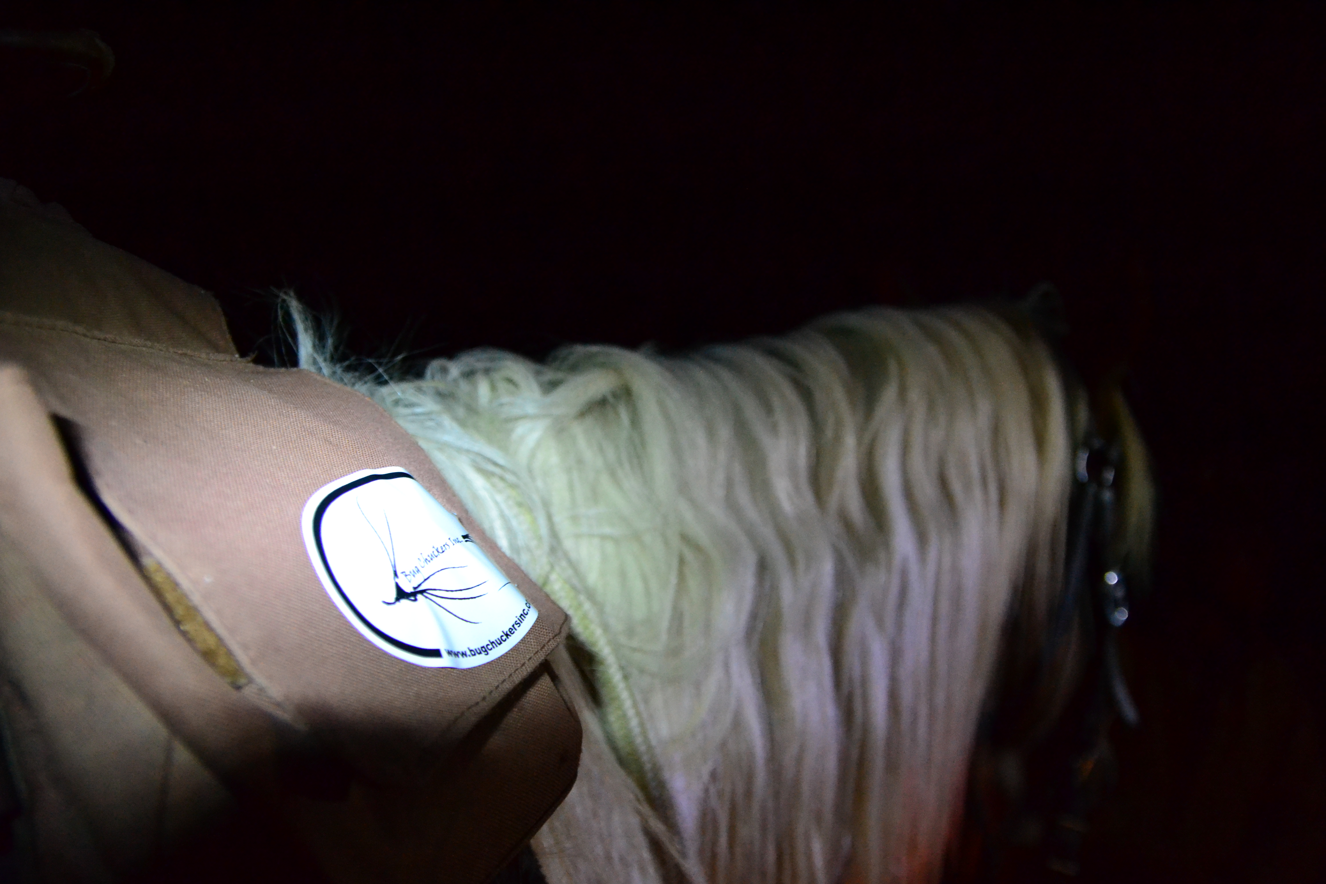 Steve-O and I decided to go warm some food up and to also make a plate for Joel and as we were doing so we saw that he was putting more wood onto the fire. It looked liked Joel was wanting to stay a little while longer. We brought the food out to him and began to tell him about Bug Chuckers Inc. and our website. We told him that we were planning to post a blog up on the site about our weekend trip but we decided instead to post a separate blog of just our Thursday experience which he was the highlight of. We told him that it was going on midnight and explained it was going to be a long ride back and he decided that it was time for him to saddle up again and hit the trail back. One thing he allowed us to do before he left was to slap a BCI decal onto his saddle bag to represent Bug Chuckers Inc. on those horse trails.