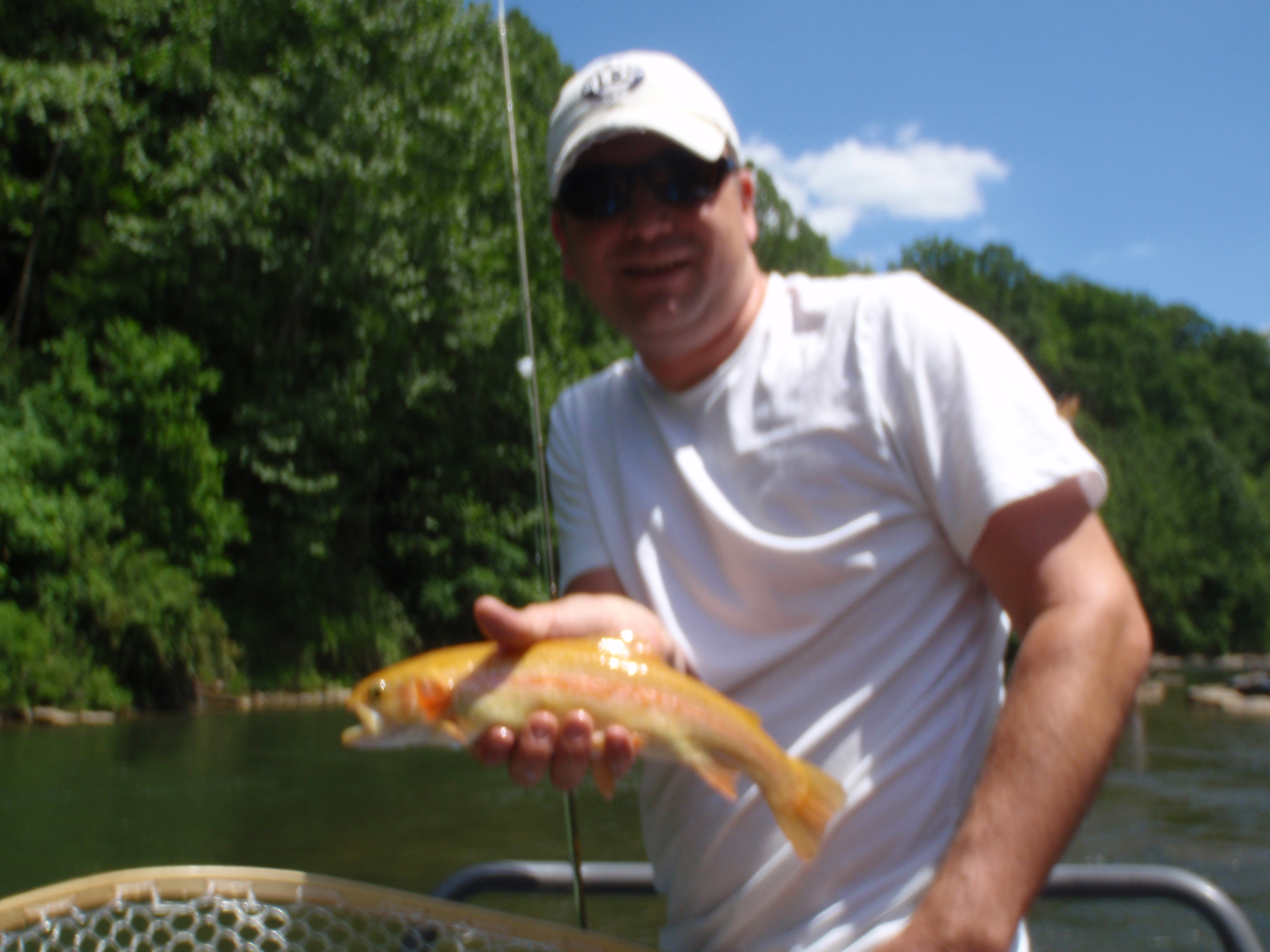 After Adam took the plunge we began the float down stream. The first few runs I looked back and the guys were taking the lines I drew for them and I knew just then that they were going to rock this river. Ryan started off in my boat fishing from the drift while Adam, Steve-o, and Greg were rocking the one man’s. The first ¼ mile Ryan missed several fish on an olive streamer. The fish he missed were holding in pocket water. We floated down a good ways before we got into some fishy water. Ryan had a good beat lined up from the front of my boat missing a couple of fish but landing a Golden.