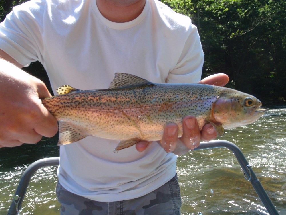 After we fished cutthroat alley I had Steve-o jump into the raft to start fishing from the drift. It wasn’t long until Steve-o was getting into the fish. Adam was close by video with his new go-pro as Steve-o connected with a healthy North Branch Bow. We floated down knowing it was starting to get late and Steve-o and Adam switched out on the front of the raft. Now it was Adams turn to give it a go. We fished hard in water that normally does not produce a lot of fish but Adam and I were determined to hook up on a North Branch beauty. Before we knew it we were in a run that had fish rising all over the place. I rigged his line up with a KG special and two casts were made with missed fish but after some good casting and sweet turtle man determination Adam hooked up. The prettiest fish of the day I apologize to Adam for being to slow on the camera but the picture below is Adam standing there after the fish jumped out of his hands. My bad man but will get her next time.