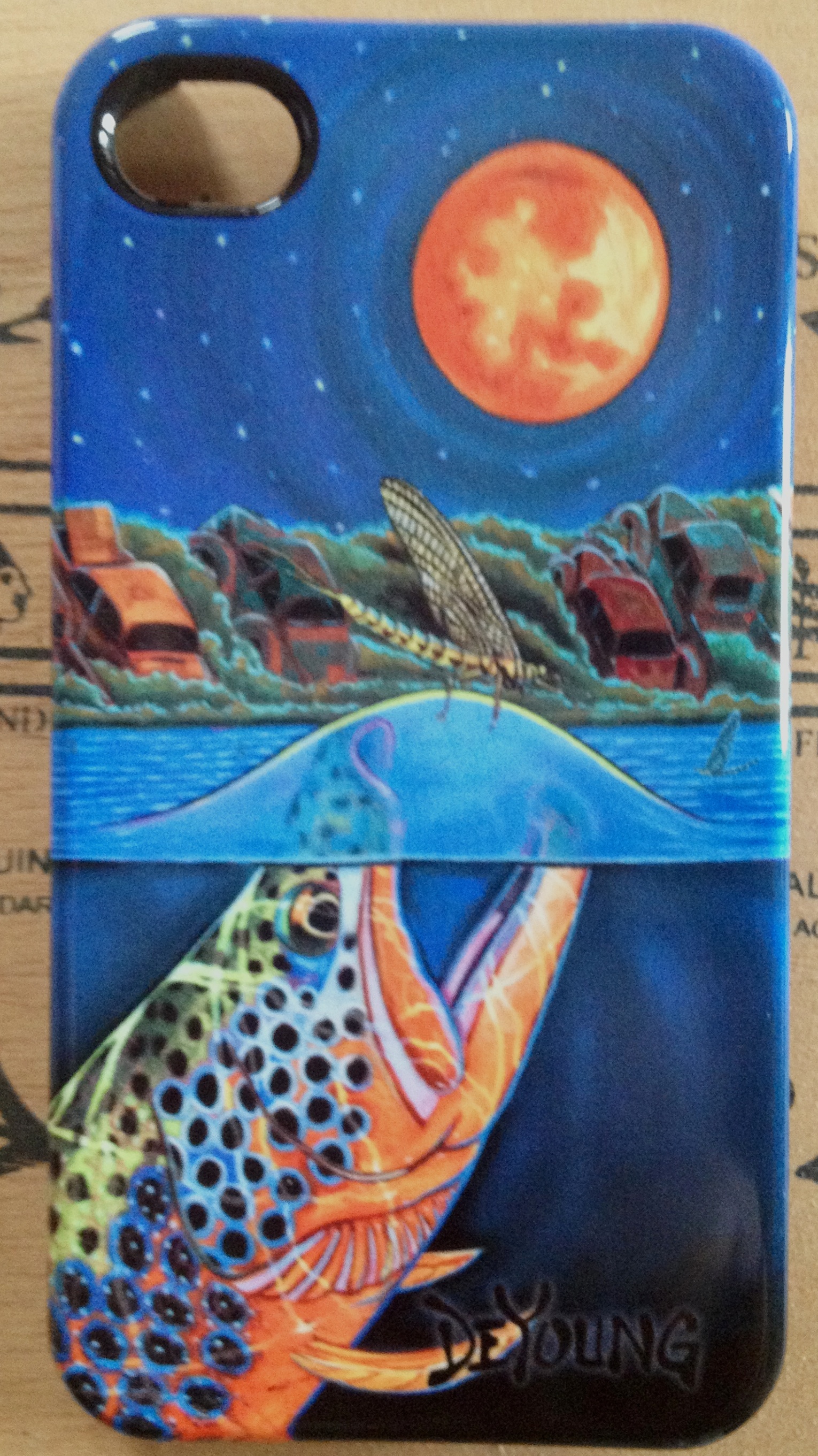Kind of bummed you can’t afford a DeYoung print or Abel reel? Have an iPhone 4 or 4s? I got an answer for you, how about a Derek DeYoung I-Phone case? I got one, and am glad i did, you will be too. It’s not too pricy for a phone case particularly one this cool and a limited edition. There are three other designs to choose from, but the Harvest Moon Riser was my choice. You can order one direct from Derek at his website www.canvasfish.com