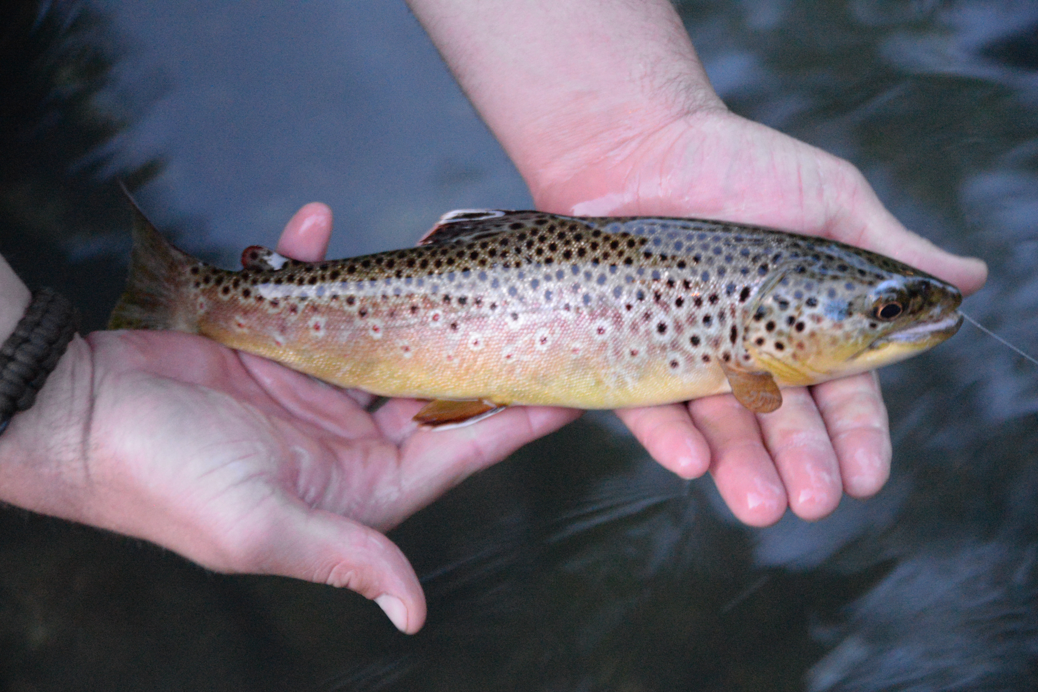 This next stretch was a delight. We caught the fading day into night here and a few fish. A few Sulfurs were winging their way around when we got there, but the fish were not very interested. As the early June sun fell lower, just behind the tops of the trees, the fish suddenly took notice of the hatching Sulfurs. Quickly we began to catch brown trout after brown trout.