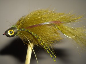 TYING INSTRUCTION: This pattern is very simple. Tie in your marabou tail, and then flash at the rear. Tie down the zonker strip down in the back, making sure the length of the zonker strip is equal to the marabou tips. Tie in the wire at this time and the estaz. Wrap the estaz forward, then wrap the wire forward and cinch the zonker strip down (with the wire) in the middle of the fly. Then wrap the wire forward to the head and tie off. Tie off the zonker strip at the head and tie in the collar/beard so that the bunny goes all the way around at the neck of the fly. Attach your head and eyes to the front of the fly using zap a gap, and then you are fininshed. Fish this using a stripping method or swinging method. Open up your loop when casting…back cast slightly side arm and the go forward over the top.